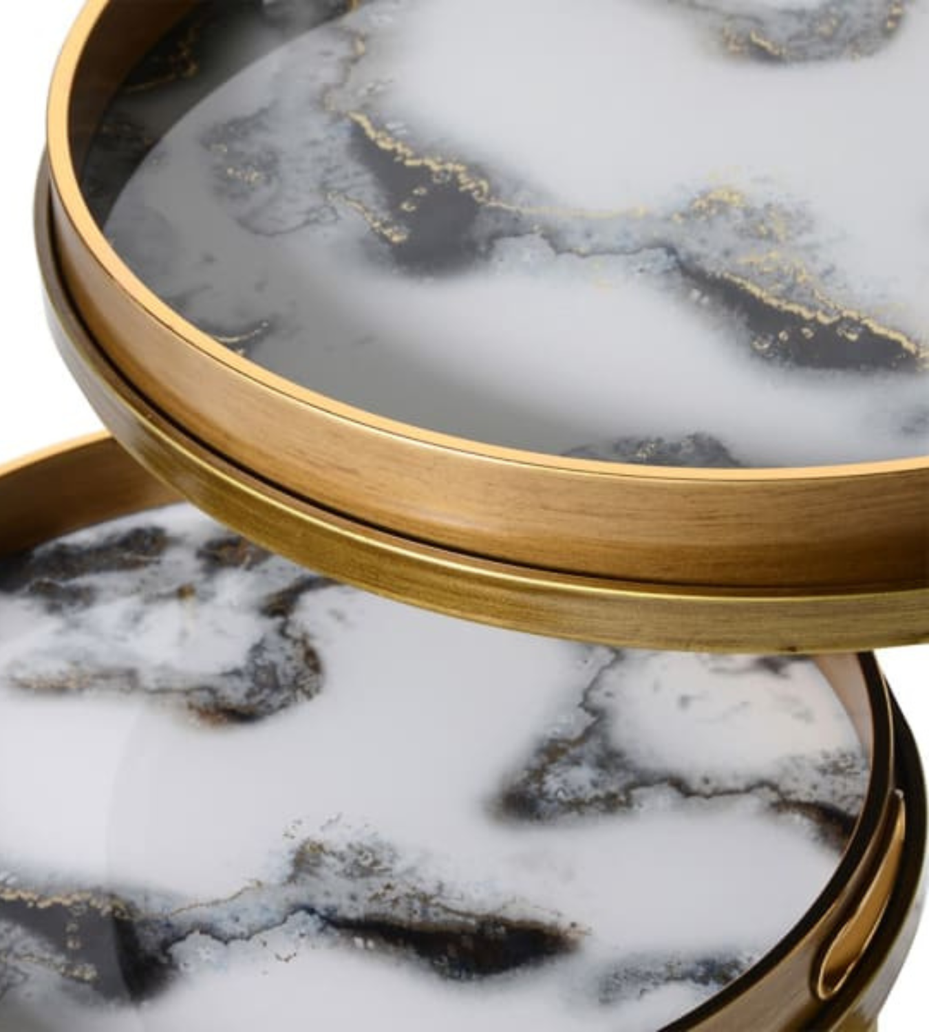 This set of two white marble effect tables will make a stylish addition to any home. Featuring sturdy metal legs, these tables are durable and easy to clean. Ideal for entertaining or as a chic accent piece, these tray tables add a touch of elegance to any living space.