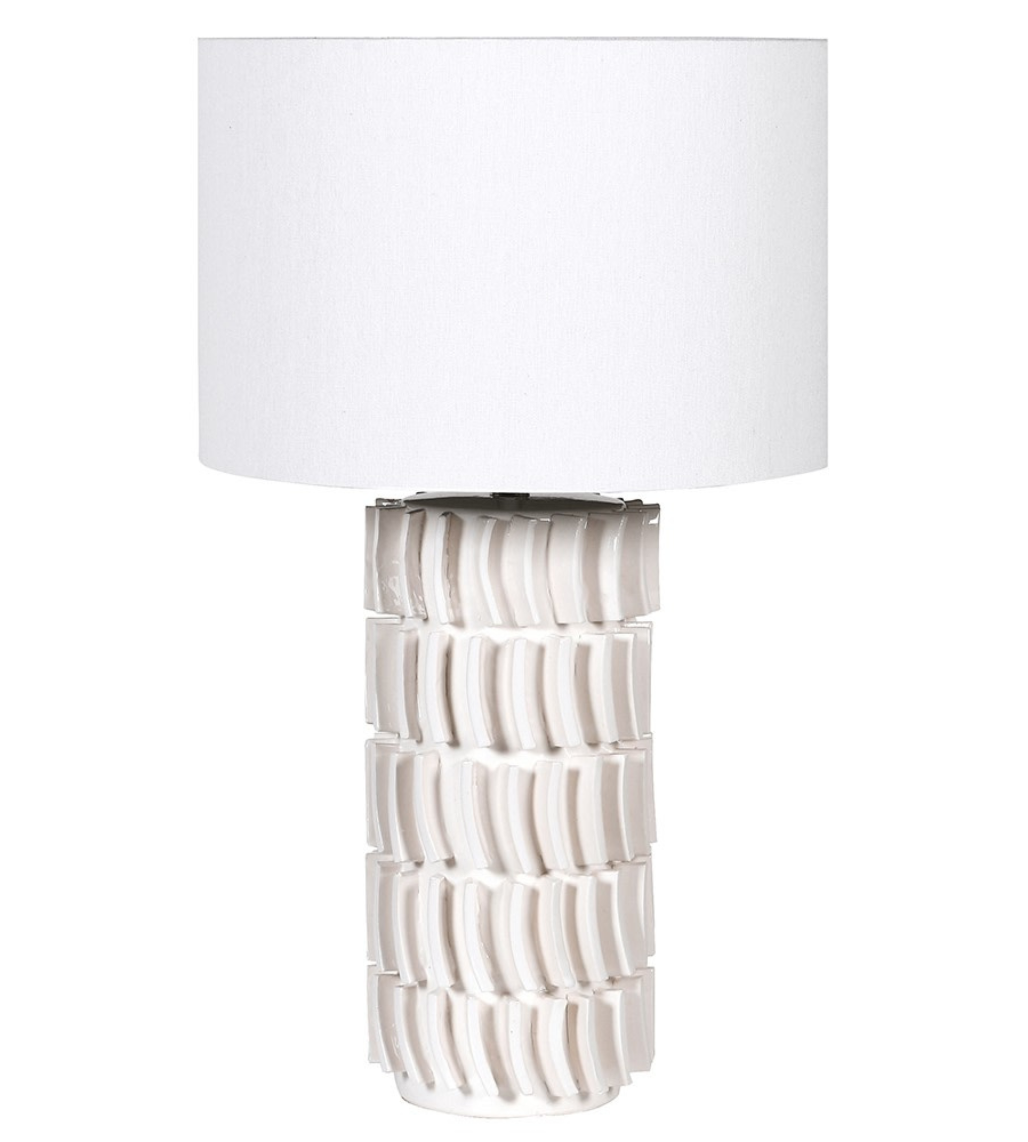 Introducing the White Tiled Table Lamp with Linen Shade by Chloe Jade Home — a striking blend of sculptural design and timeless elegance. This statement lamp features a beautifully textured white ceramic base with a tiled, layered effect that adds depth and visual interest, perfectly complemented by a classic linen shade.